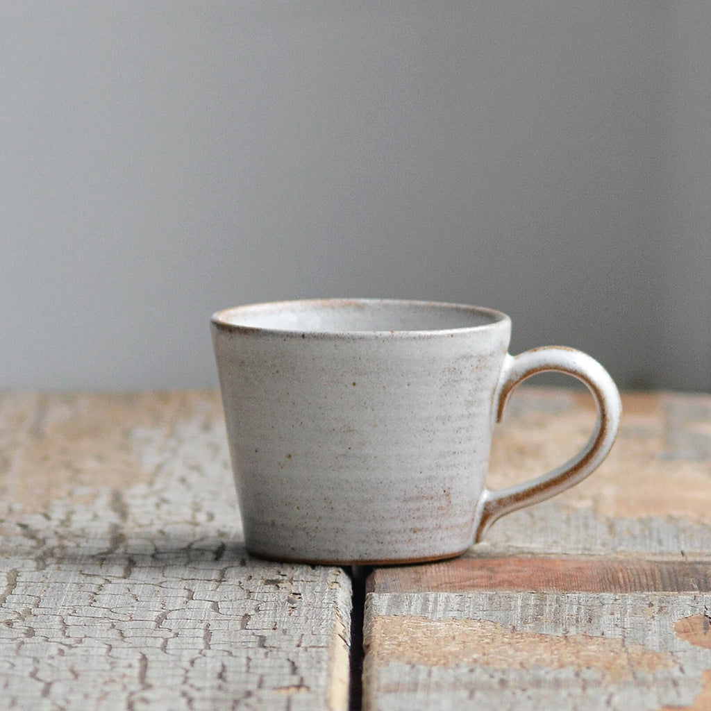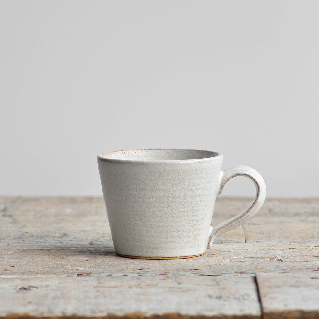 This contemporary coffee mug features a cylindrical shape with a subtle outward taper and a hand-built, textured handle. Wheel-thrown with care, it’s perfect for your americano or latte, offering a blend of modern design and artisanal craftsmanship.