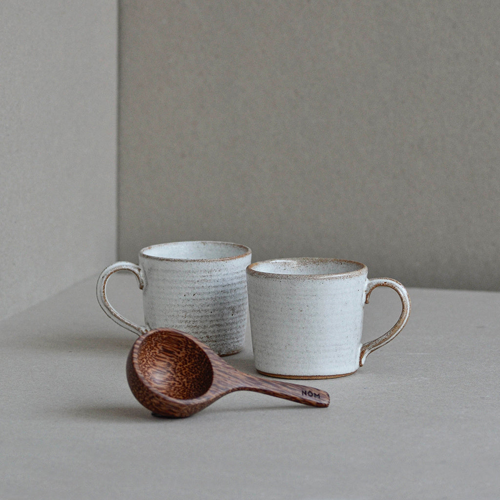 A sweet little espresso coffee set for two, including our smallest stoneware mug and a coconut palm wood coffee scoop.