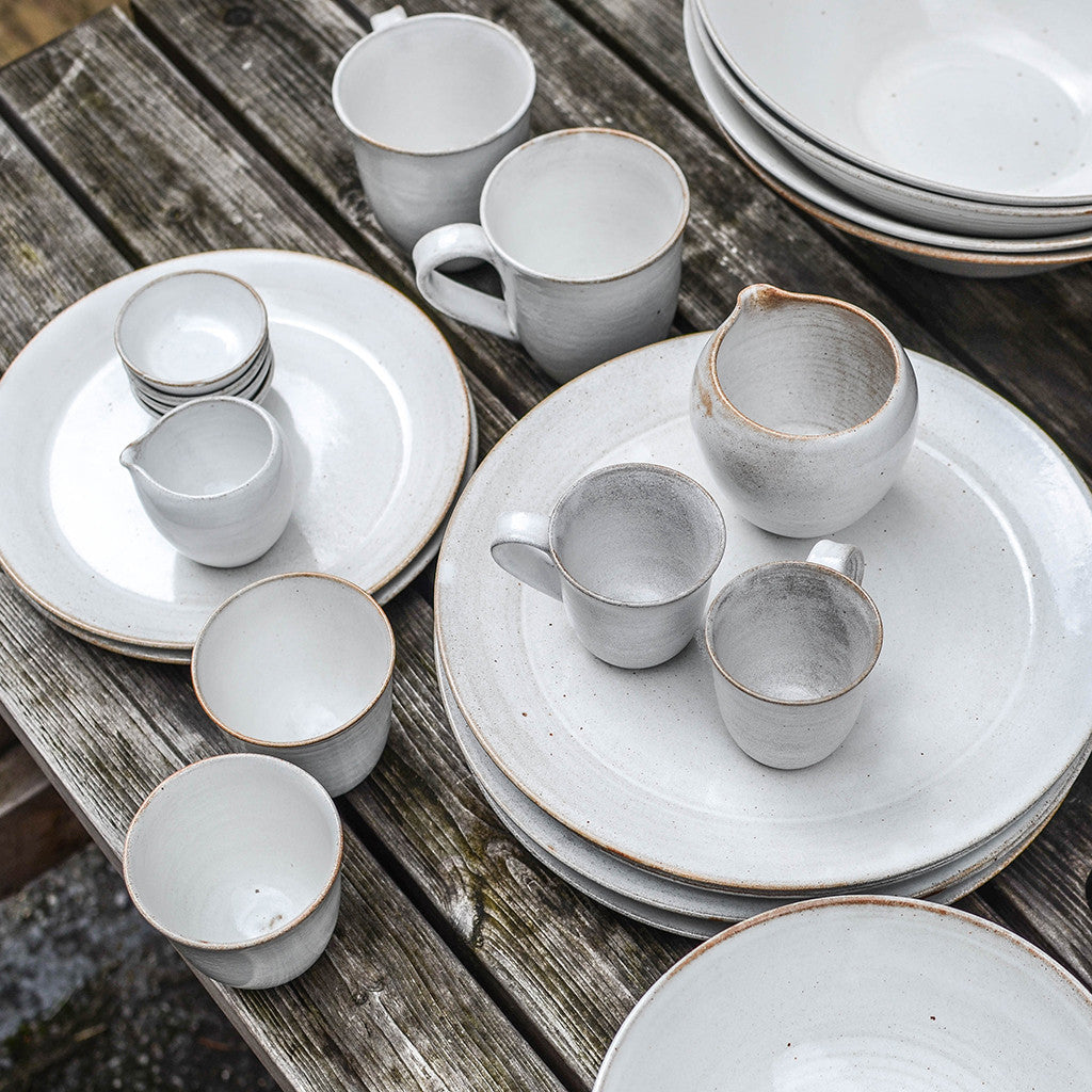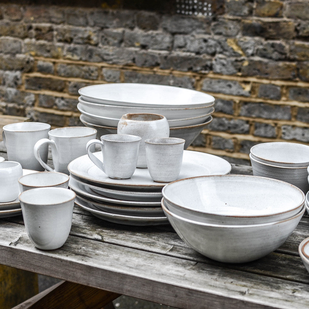 A charming, hand thrown stoneware beaker in a rustic snow white glaze. This ceramic beaker is the perfect size for green, tea, coffee or juice.