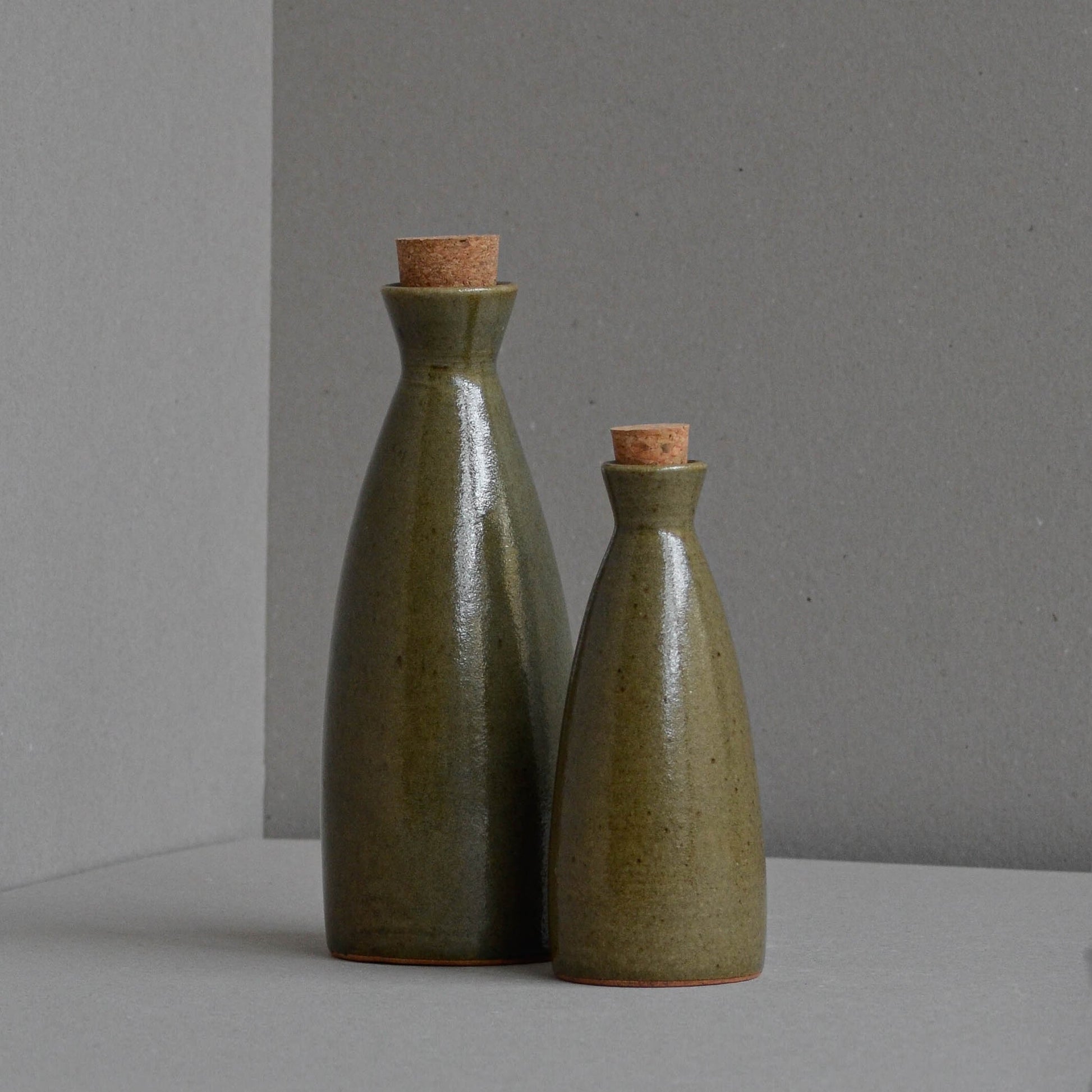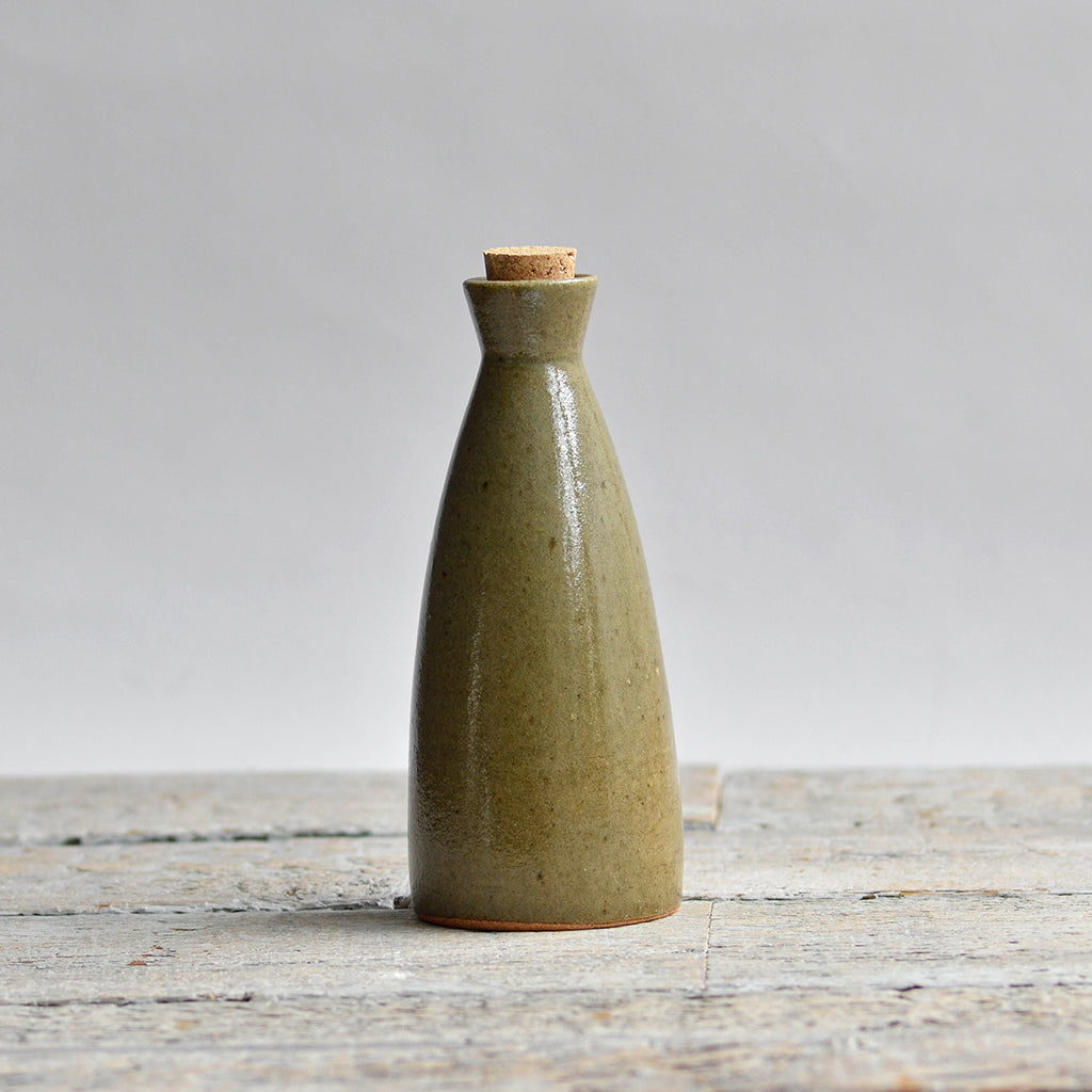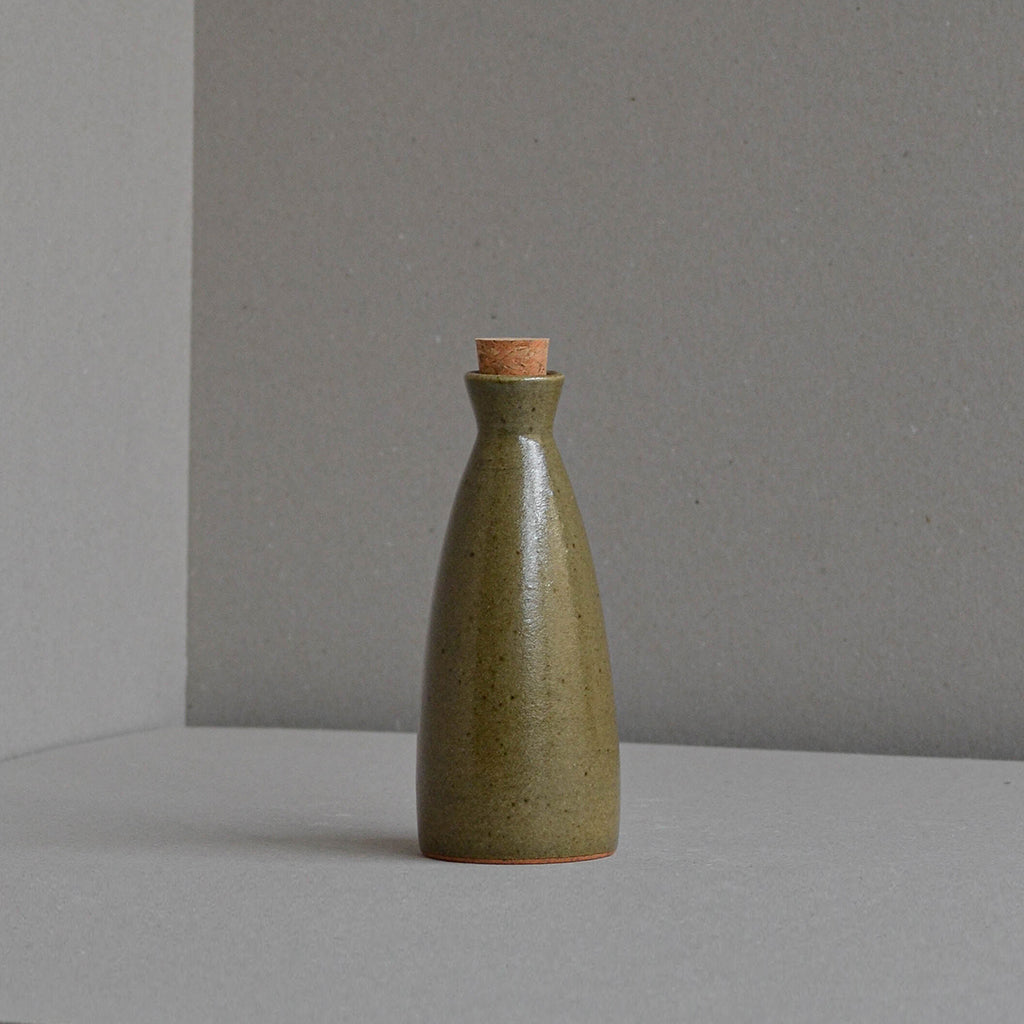 The small stoneware oil bottle is inspired by Japanese sake jugs, offering a sleek and functional design. Thrown by hand on a potter’s wheel, it features a wide base that gently tapers into a narrow neck for easy pouring. The natural green glaze adds a refreshing, organic element to its simple silhouette, making it perfect for storing and serving oils or vinegars. This handmade ceramic oil bottle brings a refined, handcrafted touch to your kitchen or dining space.
