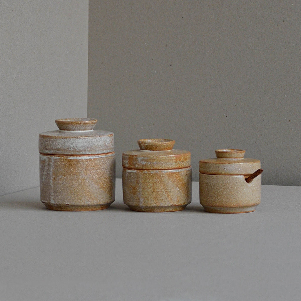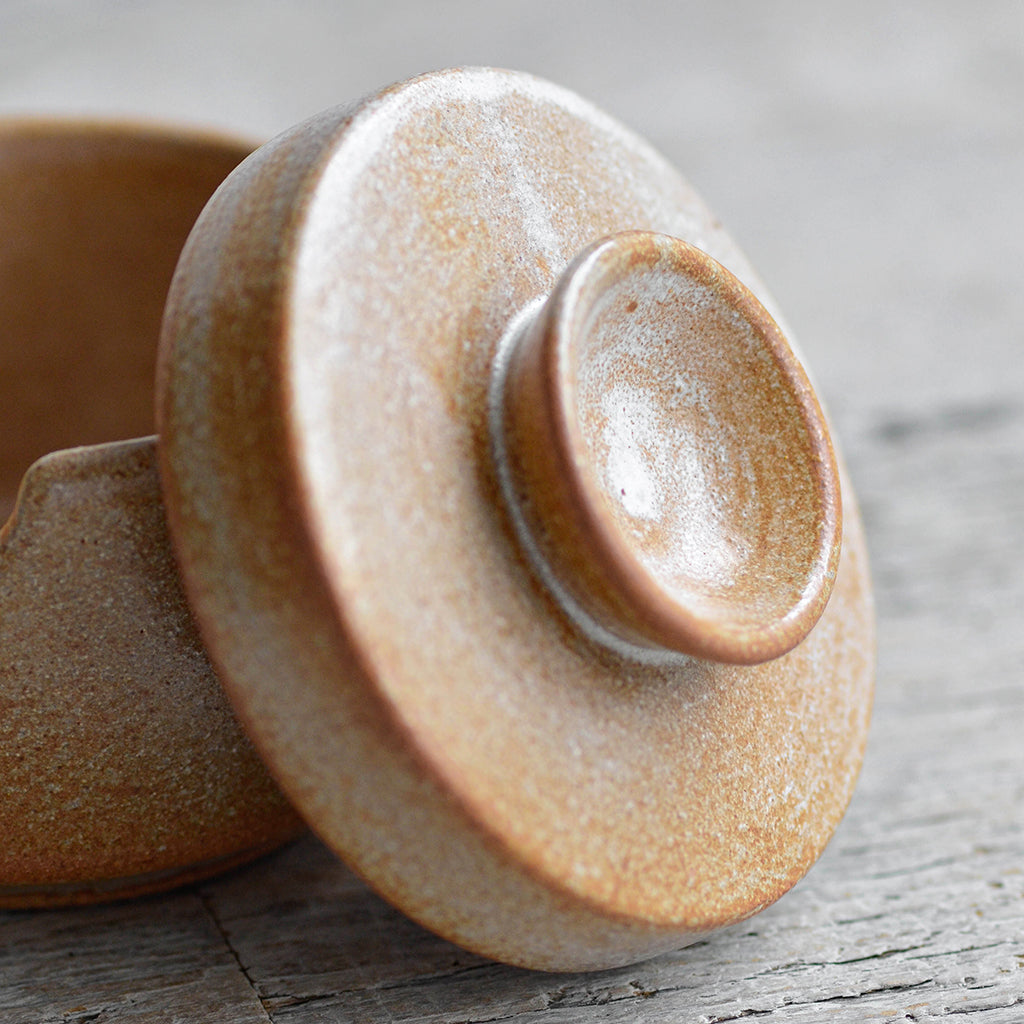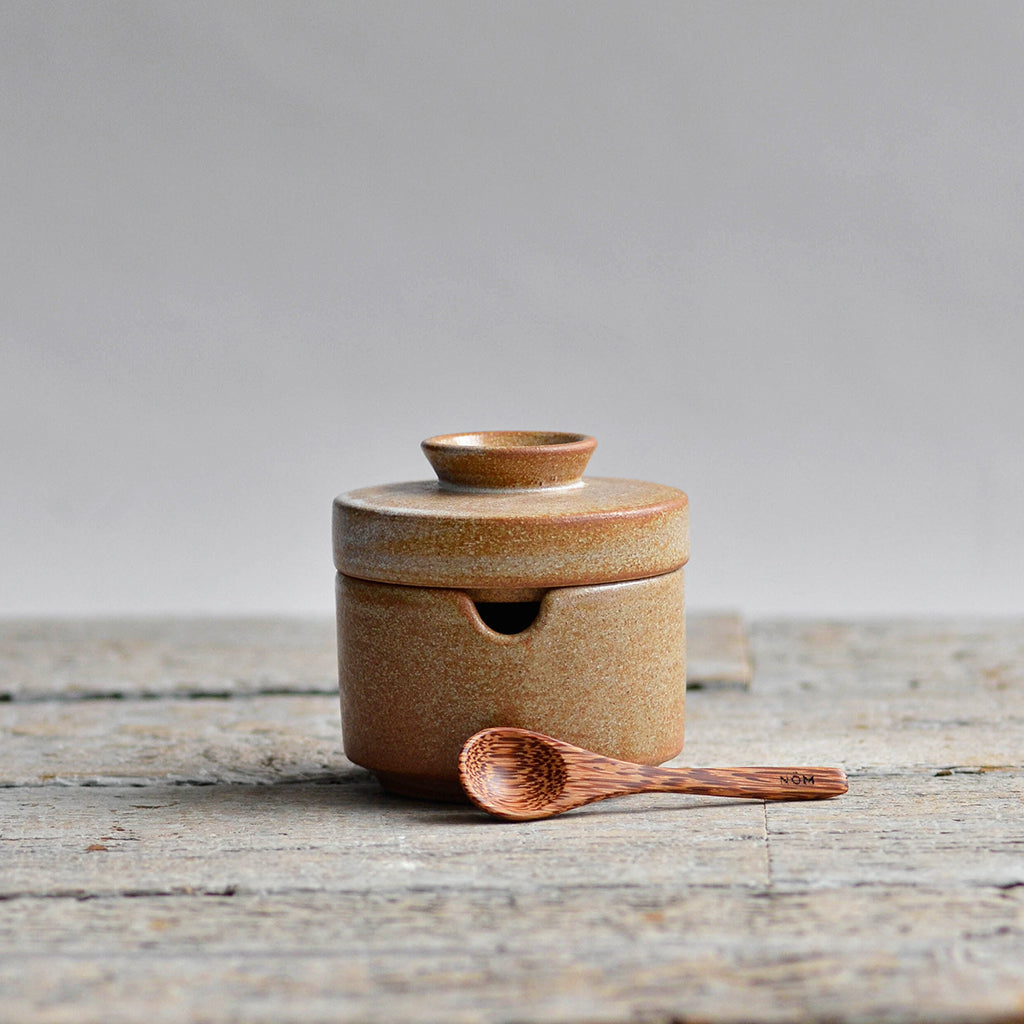 Beautifully crafted in a warm, earthy rust hue, this stoneware sugar bowl with spoon adds warmth and texture to any kitchen setting. The wheel-thrown design showcases the artisan’s skill, with an elegant, rounded form and a snug-fitting lid topped with a small knob. A practical cutout accommodates the included spoon, making it easy to serve sugar, spices, or other condiments. This handmade ceramic sugar bowl is perfect for those who appreciate the beauty of artisan-made kitchenware.