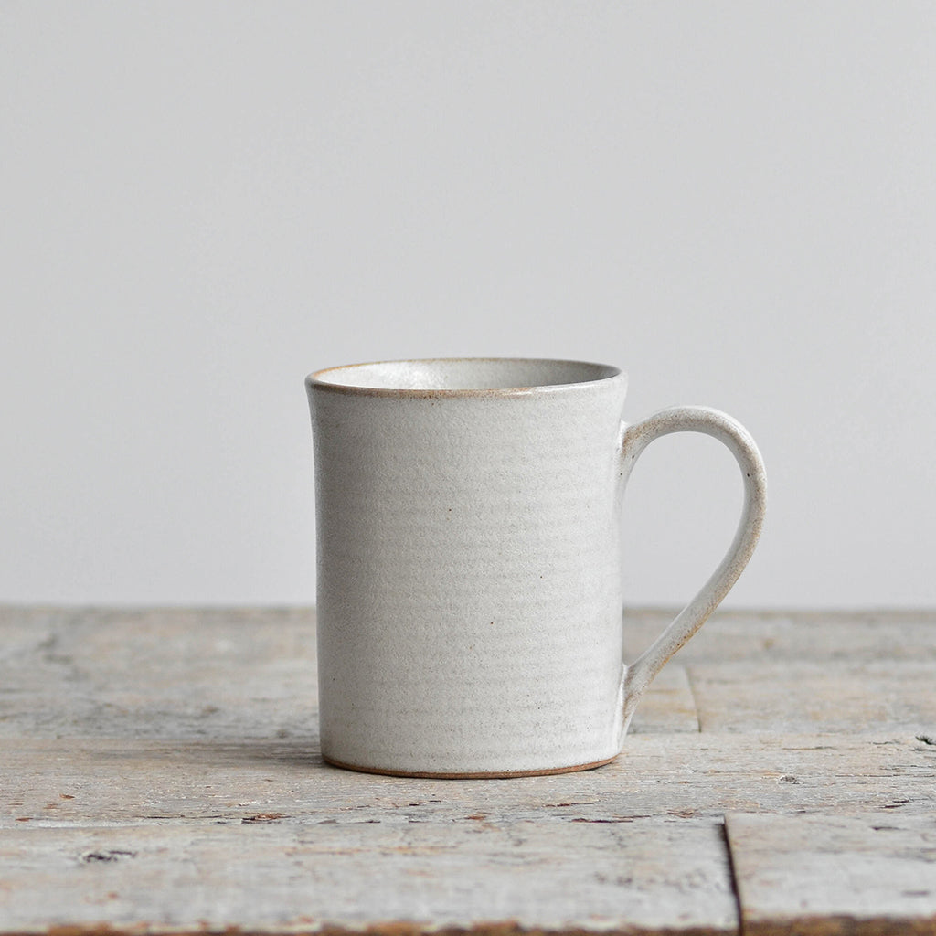 Our classic snow-white mug combines a minimalist cylindrical design with a hand-built ribbon-like handle. Wheel-thrown to perfection, its ribbed texture adds a handmade finish, making it a charming companion for your tea breaks.