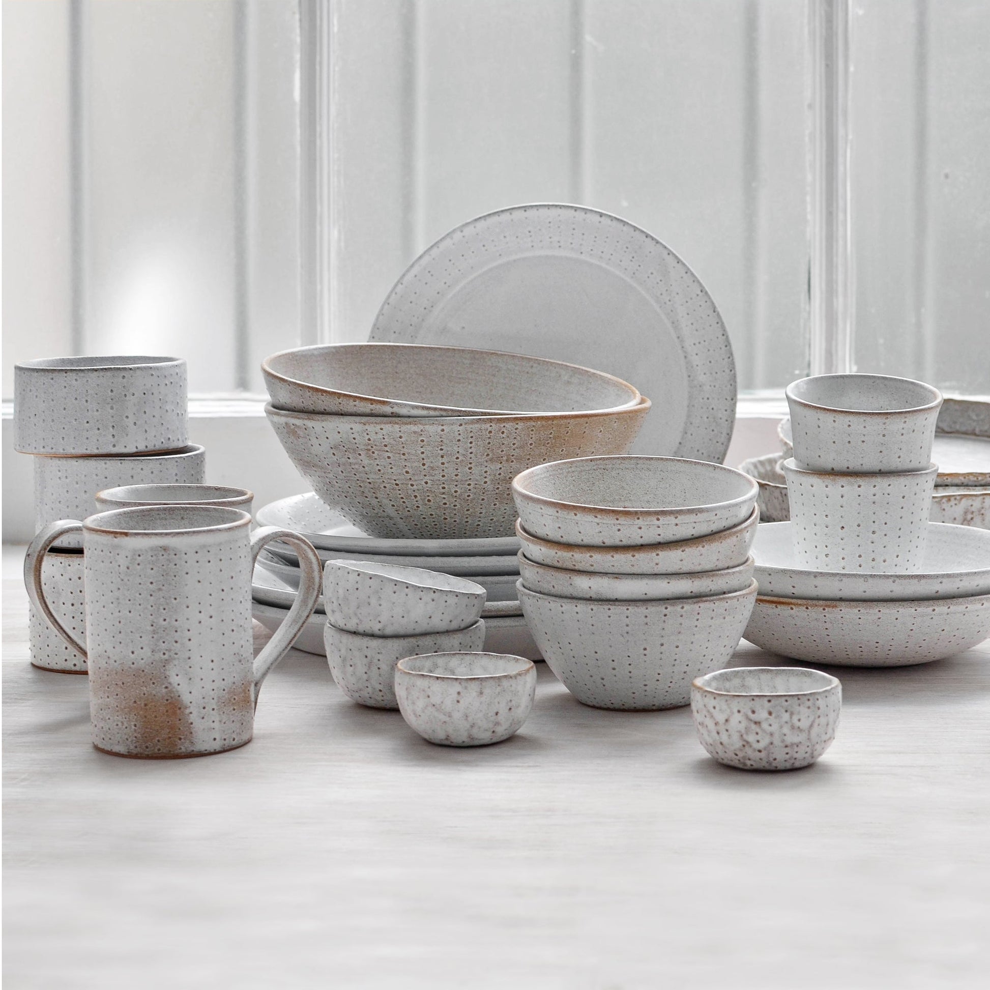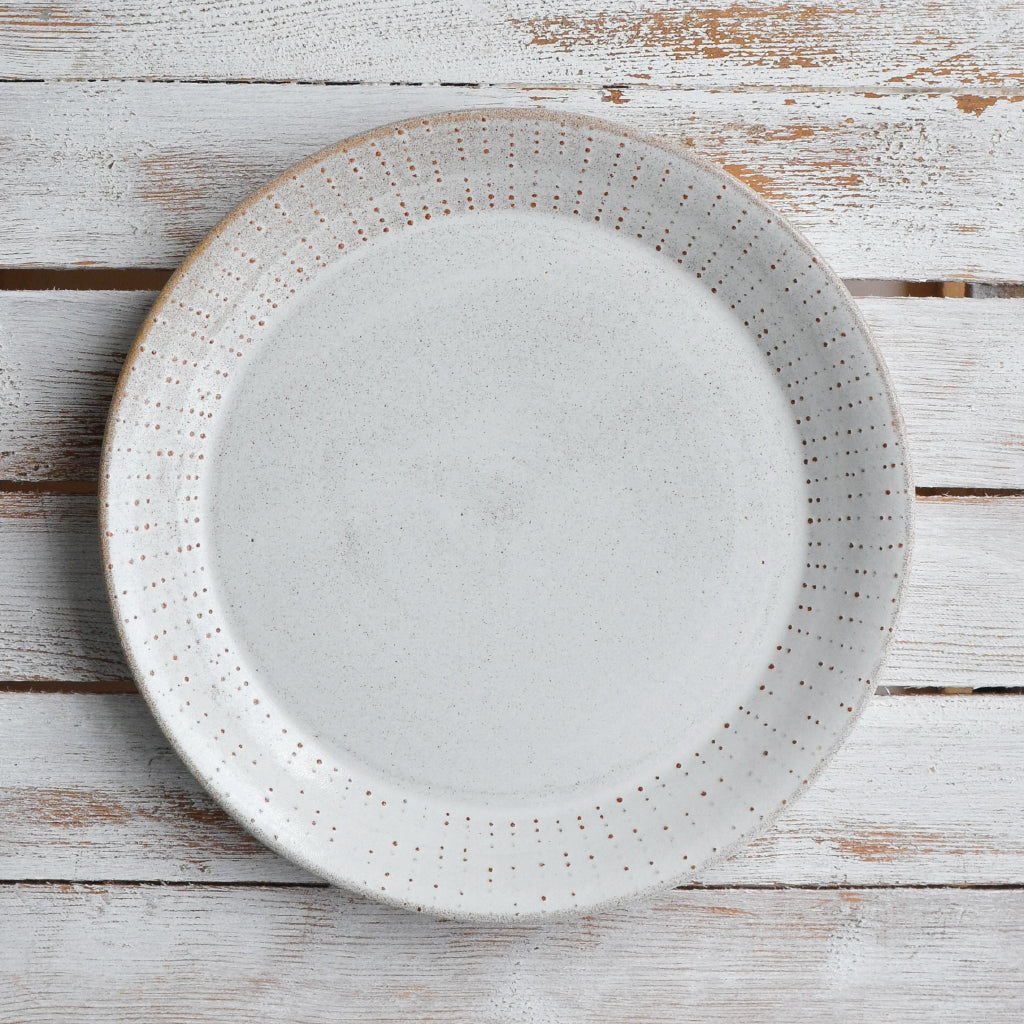 A charming, large stoneware dinner plate in a rustic snow white glaze with a intricately decorated rim, inspired by Sea Urchins. Perfect for a generous main course, or even for use as a sharing plate.